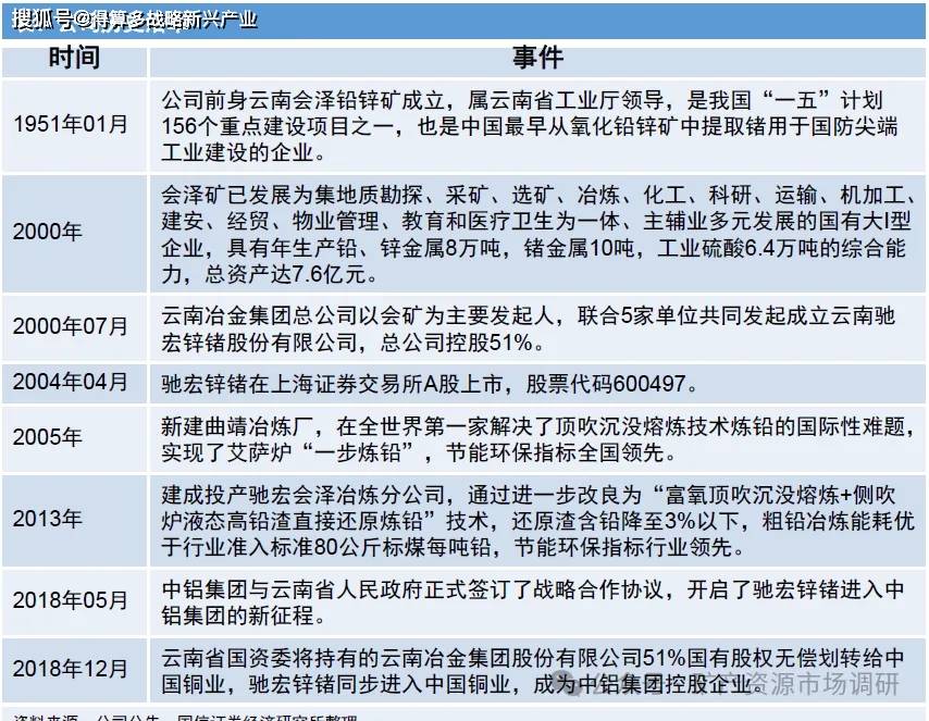 云南驰宏锌锗股份有限公司成立于2000年7月,现隶属于中铝集团。公司的前身为云南会泽铅锌矿,成立于1951年1月,是中国“一五”计划156个重点建设项目之一,也是中国最早从氧化铅锌矿中提取锗用于国防尖端工业建设的企业。公司现已发展成为在国内的云南、四川、内蒙古、黑龙江、西藏以及国外的加拿大、玻利维亚等地拥有37家分子公司的集团化、国际化企业,资源品种覆盖铅、锌、锗、银、金等多种有色金属。