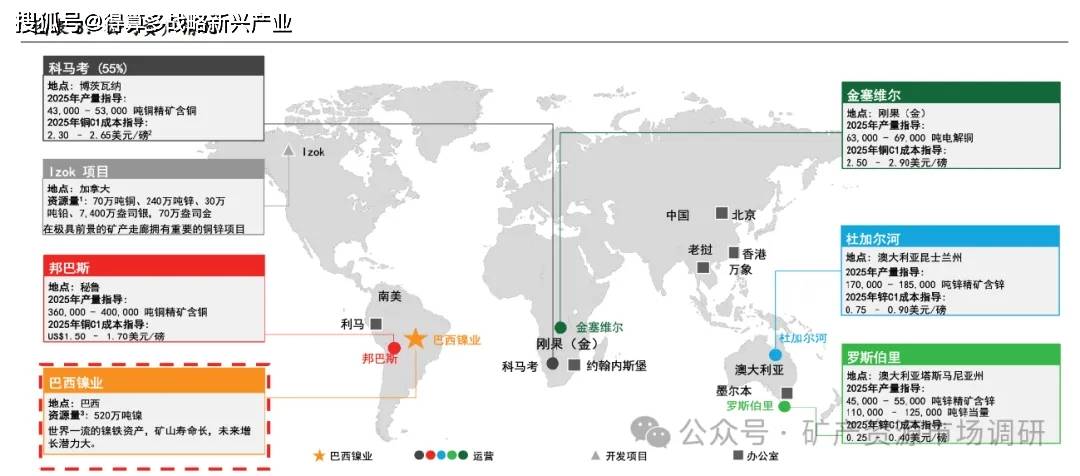 截止2024年底,公司主营矿山为5座海外矿山,分别是3座铜矿——秘鲁的Las Bambas铜矿、博茨瓦纳的Khoemacau铜矿和刚果(金)的Kinsevere铜矿,与2座锌矿山——澳大利亚Rosebery锌矿、澳大利亚Dugald River锌矿。
