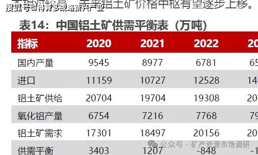 铝土矿是生产氧化铝的核心要素,碱法是当前主流的工业化生产方式。铝土矿是一水软硬铝石及三水铝石为主的矿石,表现形态为高岭土、赤铁矿及石英等,储量形态以红土型铝土矿为主。铝土矿下游需求的90%为生产氧化铝,而全球超过90%的氧化铝又以铝土矿作为生产原材料,因此铝土矿作为氧化铝必备的生产要素具有显著的不可替代性。而生产方式上,铝土矿生产氧化铝大致可分为四类,分别是碱法、酸法、酸碱联合法和热法,其中碱法是当前主流的氧化铝生产方式。所谓碱法生产就是用碱来分离铝土矿中的氧化铝(转变成铝酸钠溶液)及赤泥(铁、钛等不溶解化合物残渣),分解过后的铝酸钠溶液再进行进一步的解析从而得到氢氧化铝,然后通过进一步的焙烧得到氧化铝产品。