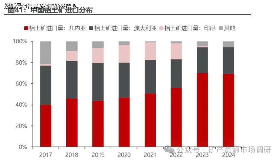 我国铝土矿进口主要来源为几内亚、澳大利亚。据海关总署数据统计, 2024年我国从几内亚进口铝土矿 11054 万吨,同比增长 11.3%11.3%,占总进口的比例为69.7%69.7%,从澳大利亚进口铝土矿 3989 万吨,同比增长 15.3%15.3%,两者进口占总进口的 94.8% 。近几年,几内亚作为我国铝土矿第一大供应国,进口量呈现持续增长趋势。由于 印度尼西亚于 2023 年 6 月执行铝土矿出口禁令 ,印尼对中国铝土矿出口断崖式下滑,导致我国铝土矿进口来源结构逐步向几内亚倾斜。
