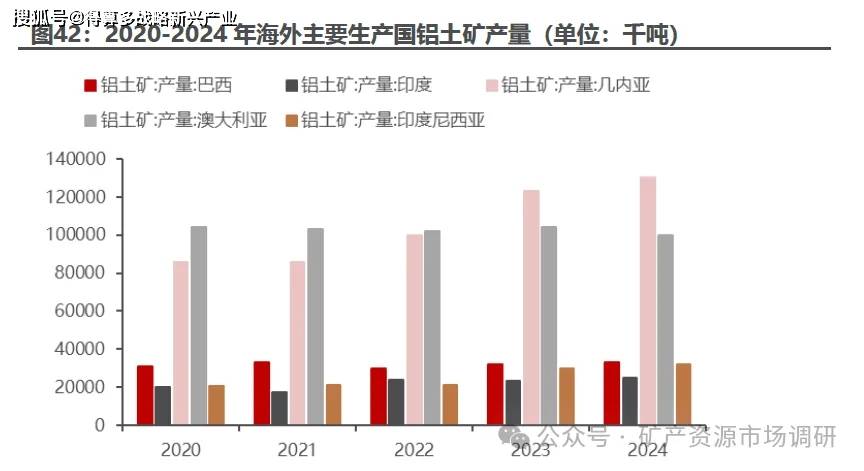 几内亚作为重要的资源型国家,铝土矿产量持续增加。 几内亚为全球第一大铝土矿生产国,近五年产量持续增长, 2024 年产量 1.3 亿吨,同比增长 5.7% 但由于所处地理位置的气候拥有长达半年的雨季,对铝土矿的开采和运输上造成了极大的困难。 2023 年底,几内亚境内曾发生大型燃油仓库爆炸事故,同时当地出现一部分罢工行为,未知的波动因素使得几内亚铝土矿供应面临不确定性。澳大利亚铝土矿产量较为稳定,近几年产量保持在 1.0 亿吨上下。印尼铝土矿产量增长较快,从 2020 年的 0.21 亿吨增至 2024 年的 0.32 亿吨,但由于禁止出口, 对我国供应影响不大。