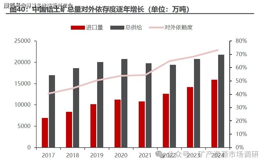 海外铝土矿弥补国内缺口,中国铝土矿进口规模逐年增长。202 4 年中国铝土矿进口总量约 1.59 亿 吨,同比增长 12.3 %%,总供给量 2.17 亿吨,202 4 年铝土矿对外依存度高达 73 。中国铝土矿低储高产的模式导致自给率不足问题逐渐显现,201 7 202 4 年我国铝土矿对外依存度 持续 上 升 ,尤其 202 4 年铝土矿进口量约为国内年产量的 3.7 倍。