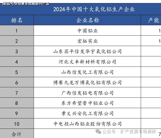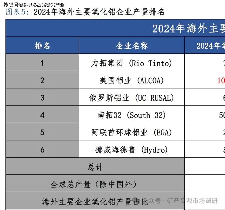 10、2024年海外主要氧化铝企业产量排名