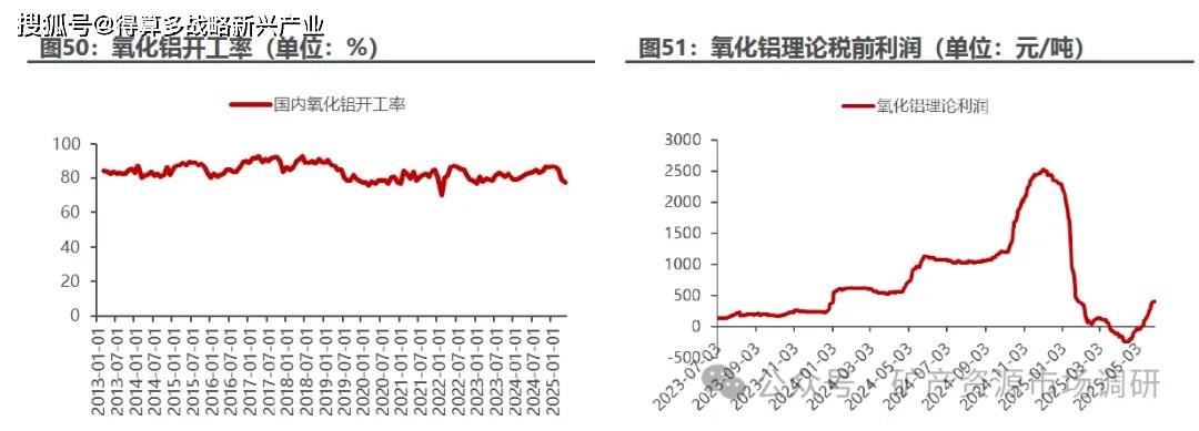 氧化铝利润大幅回落,开工率提升幅度有限。 随着价格回落,氧化铝盈利大幅下滑, 2025 年 5 月,全国氧化铝开工率 77.3%77.3%,环比下滑 1.5pct ,同比下滑 5.0pct,同时受制于矿石供应不稳定及配矿等因素,国内氧化铝存量项目产量提升有限,未来必须看到沿海新增产能投产才能扭转氧化铝的基本面。
