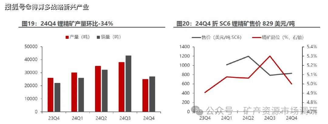 24Q4矿山停产,出清15万吨锂精矿产能,尚未复产。1)量:由于锂价下跌,矿山自2024年11月起停产,12月实现最后一批矿石销售,矿山精矿产能15万吨,24Q4锂精矿产量2.5万吨,环比-34%,平均品位5%,环比-0.3pct,销量2.7万吨,折SC6销量2.2万吨,环比-42%。目前矿山尚未复产。2)价:24Q4折SC6售价829美元/吨,环比+5%;3)本:24Q4折SC6的FOB成本1153美元/吨,高于2025财年800-890美元/吨的指引,主要矿山停产导致产量下降。4)2025财年销量指引下调:由于矿山停产,2025财年锂精矿折SC6销量指引由12.0-14.5万吨下调至6万吨。