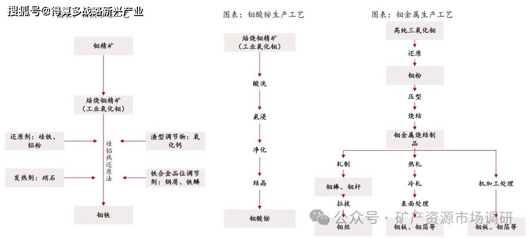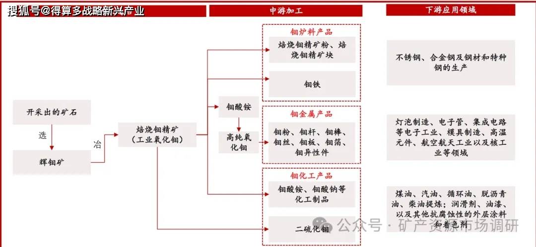 钼产业链主要分为上游的矿石采选和钼精矿的生产,中游的焙烧和冶炼,以及下游的精深加工。