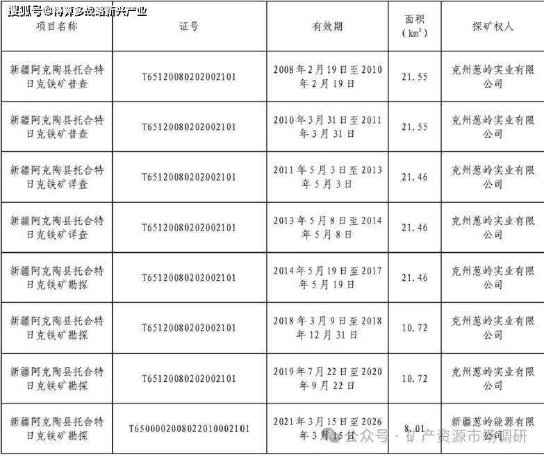 2014年,矿产资源勘查许可证延续变更,勘查项目名称为新疆阿克陶县托合特日克铁矿勘探,有效期限2014年5月19日至2017年5月19日。