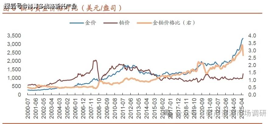 2025 年,金铂价格比一度触及历史高点。2008-2015 年间,金与铂的价格比在1.0 上下,随着铂价在2011-2018 年间持续下行,金铂价格比明显抬升,2018年之后铂价底部震荡而金价中枢再度提升,2023 年以来金价更是一路走高,使得金铂价格比在2025 年5 月一度达到3.38 的高位,6 月之后金价震荡调整,铂价补涨,价格比回落至2.68。