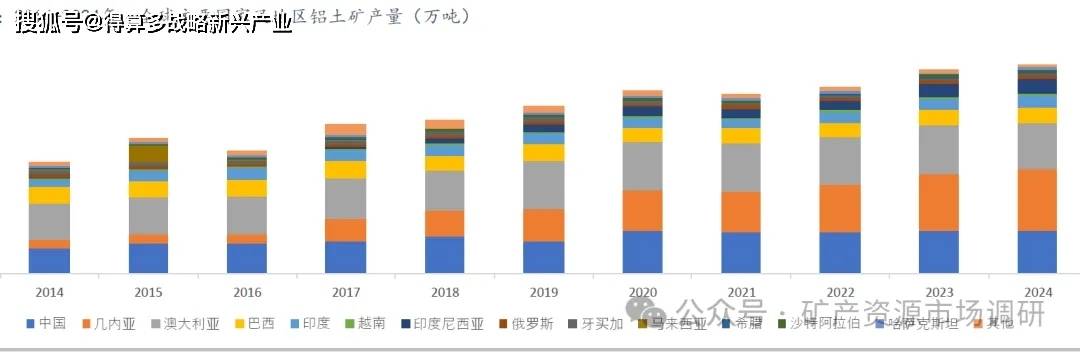 过去多年,全球铝土矿的产量不断提高。据美国地质调查局数据,2024年全球铝土矿产量4.5亿吨,前三名分别为:几内亚产量13000万吨,占比28.89%,主要矿山有桑加雷迪Sangaredi(拓持股23%、美国铝业持股23%),博凯Boké(美国铝业持股23%、Winning International Group 持股45%),几内亚氧化铝公司(GAC)(由阿联酋环球铝业运营)等多个年产量1000万吨以上的铝土矿。澳大利亚产量10000万吨,占比22.22%,其中51%的铝土矿来自于西澳大利亚州,38%来自于昆士兰州。由于下游氧化铝需求巨大,中国维持了较高的铝土矿产量为9300万吨,占比20.67%,同时,几内亚和澳大利亚是中国进口铝土矿的主要来源,分别进口铝土矿11,058 万吨和3,989 万吨。
