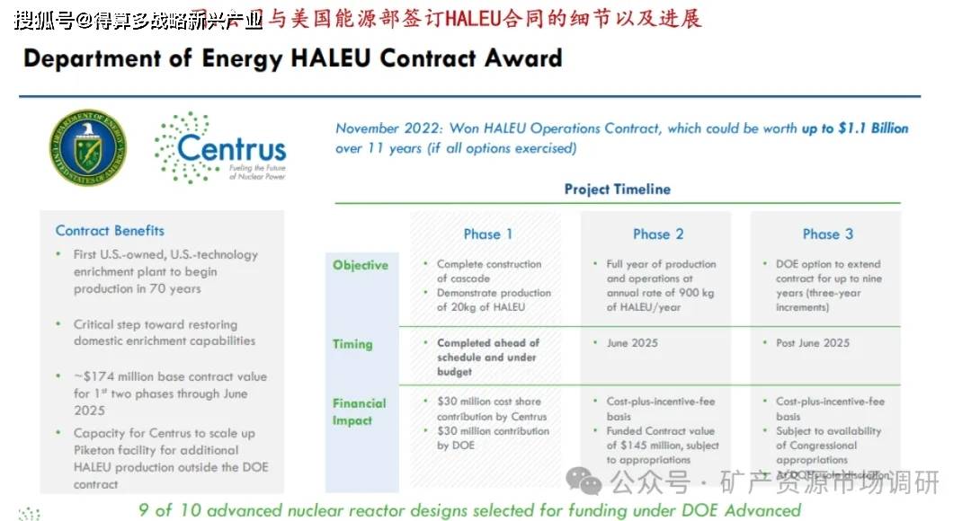 2022年CentrusEnergy与美国能源部签订HALEU合同,2023年11月公司向美国能源部交付第一阶段要求的HALEU,产能为20kg/年;之后过渡到第二阶段,目标每年生产900kg HALEU,由成本分摊模式转变为成本加成激励费用模式。2025年6月,完成交付900kg HALEU,进入第三阶段,同时能源部签署了一项合同修正案,将前三年的延长期分为一年延长期和两年延长期。国防部已行使了其中的第一项选择权,启动了第三阶段,通过以下方式增加HALEU的生产:2026年6月30日合同中的其余选择权(由国防部全权决定并受拨款约束)如果得以行使,将在当前延期之后提供最多八年的额外生产。