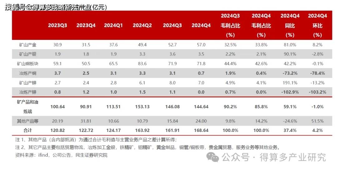 4.56pct至20.37%。2)分季度看,2024Q4公司单季度毛利润同比增37.4%、环比增4.2%至168.64亿元,毛利率同比增5.08pct、环比增2.78pct至23.02%。我们认为,公司2024年毛利润同比大幅增长主要得益于铜金产品量价齐升的同时成本上涨的势头得到遇制,单位毛利持续增长。2024年综合毛利率同比增长4.56pct,主要是由于高毛利的矿山端毛利占比提升。分季度看,2024Q4毛利率环比略有上升主要在于营收环比下降,或由于低毛利率高营收的贸易业务收缩。
