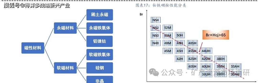 根据磁性能保持的不同,磁性材料分为永磁材料和软磁材料,永磁材料分为永磁铁氧体、铝镍钴和稀土永磁等,软磁材料分为软磁铁氧体、硅钢和非晶等。稀土永磁又分为钐钴和钕铁硼,钐钴具有更高的居里温度,耐高温性更好,主要应用在军工领域。钕铁硼具有更高的磁能积,需求不断增加,是稀土永磁需求量最大的产品。钕铁硼材料根据剩磁和矫顽力的大小进行分类,中国和日本在该领域做出了巨大贡献,磁性能不断提高,Br+Hcj>65,定义为高性能,下游客户不断对稀土永磁性能的要求,科研实力成为重要支撑。
