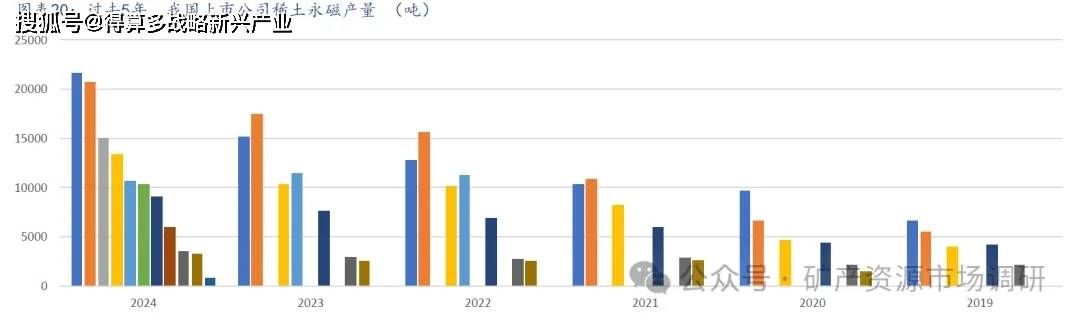稀土永磁高效率、小型化、轻量化的特征优势日益显现,被广泛应用到汽车、节能电机、轨道交通、机器人、白色家电、消费类电子、新能源和航空航天等领域,需求逐年增长。我国稀土永磁头部企业规模较大,2024年,金力永磁和正海磁材的产量均超过2万吨,主要上市公司的成品产量在12万吨左右,折合成毛坯产量约为15万吨。另外,还有很多规模在5000吨以下的非上市公司公司,大约占比在40%,因此我们预测2024年,全年稀土永磁毛坯产量超过25万吨,世界第一。