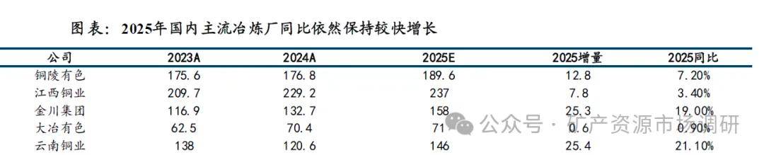 2025年国内主流冶炼厂依然保持较快增速,主流冶炼厂2025年指引合计增长4万吨,同比增长。据SMM数据,国内19家主流冶炼厂2025年产量指引合计增长84万吨,同比保持高速增长,但受制于矿端供应,我们预计国内非主流台炼厂及海外冶炼厂将出现减产。