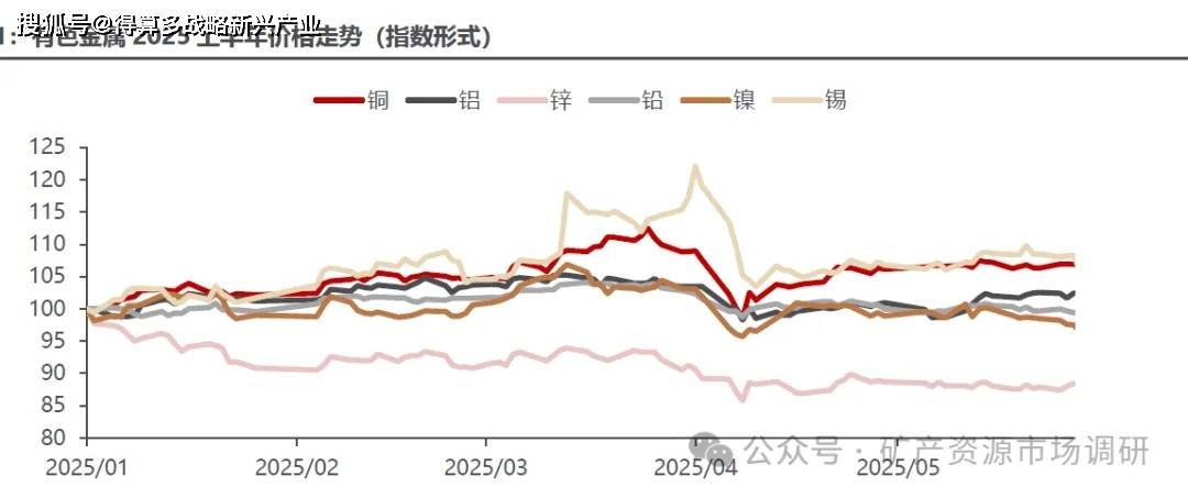 分品种来看,工业金属整体价格走势强弱不一,铜、锡表现相对突出 。截至202 5 年 5 月 30 日,除 铝锌 以外的基本金属 LME 价格较年初 实现 上涨,其中 铜 涨幅最大,为 7.91 。铅、锡 、镍 涨幅分别为 1.58 、 6.22 、 1.76 %%,铝、锌 价格下降 分别下降 3. 18 、 10.07% 。基本金属 SHFE 价格 涨跌不一 铜 涨幅最大,为6.07 。 铝 、 锌 、 铅、锡、 镍分别 变化 0.98% 、 11.59% 、 1.16% 、 2.61% 、 3.69% 。