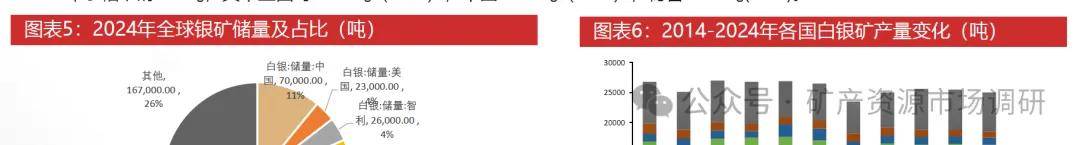 ◼ 白银全球分布广泛。根据USGS,2024年全球钨矿储量64万吨,秘鲁14万吨(22%)、澳大利亚9.4万吨(15%)、中国7万吨(11%)、波兰6.1万吨(9%)。