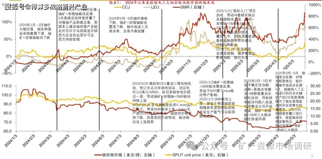 SMR板块(代表标的:SMR、OKLO、NNE)呈现出最强弹性,表现出“AI+政策”双轮驱动特征。2024年9月起,受微软、谷歌等科技巨头密集投资SMR及AI算力用能转型影响,SMR板块率先启动,市场对商业化路径与估值模型重构形成强烈预期。此后,COP29路线图出台、“星际之门”项目启动、新部长政策落地等事件接力催化,使板块在2024年11月至2025年2月期间实现主升浪行情。2025年5月再度启动,反映出SMR具备长期趋势+高频催化的交易属性,是核能产业链中资金偏好最集中的方向。