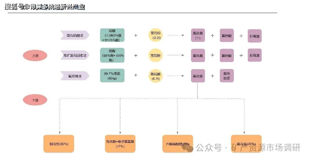 无水氢氟酸即无水氟化氢(AHF),分子式为 HF,无色透明液体,是氟盐、氟制冷剂、氟塑料、氟橡胶、氟医药及农药所必须的氟来源,同时是一种用途广泛的化工产品,广泛应用于原子能、化工、石油等行业。氢氟酸(BHF),为氟化氢的水溶液,具有强烈腐蚀性,能迅速腐蚀玻璃等含硅材料,主要用于金属清理及表面处理,集成电路工业中芯片清洗与腐蚀等领域。无水氢氟酸连接了上游萤石资源和下游氟化工,是氟化工基本化工原料,2022、2023 年我国无水氢氟酸消费结构中用于生产制冷剂的比例分别是47%、50%。