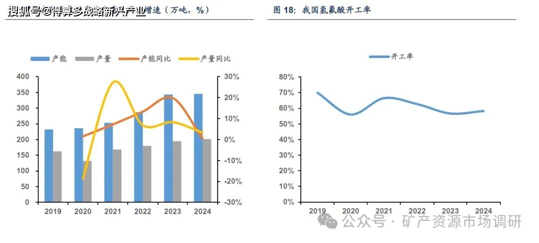 我国氢氟酸产能产量在近年保持增长,开工率略有下滑。2019-2024 年,我国氢氟酸产能从232 万吨增长至345 万吨,CAGR 为8.24%,产量从163 万吨增长至201 万吨,CAGR 为4.35%,开工率从69.92%波动下滑至58.24%,主要是新产能的投放所致。