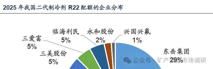 我国三代制冷剂进入配额时代。为落实《〈关于消耗臭氧层物质的蒙特利尔议定书〉基加利修正案》,达成2024 年将氢氟碳化物(HFCs)的生产和使用量控制在基线水平的目标,2024 年1 月,我国生态环境部依据《中华人民共和国大气污染防治法》和《消耗臭氧层物质管理条例》的相关规定,出台了《2024 年度氢氟碳化物生产、进口配额核发表》。在该方案中,生态环境部向34 家单位分配了2024 年度的氢氟碳化物(不含三氟甲烷)的生产配额和内用生产配额,确保未来三代制冷剂的生产和销售活动严格遵守这些配额限制。2024 年12 月,生态环境部公布了2025 年配额。2025 年我国三代制冷剂总生产配额为79.19 万吨,其中R32 生产配额为28.03 万吨,占总配额的35.40%。