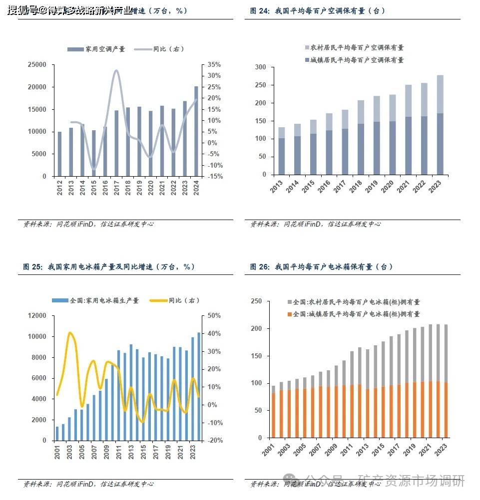 近年下游规模呈扩张趋势,有望拉动制冷剂需求。2012-2024 年,我国家用空调产量、家用电冰箱产量、汽车产量CAGR 分别为6.03%、1.76%、4.19%。同时,我国城镇、农村居民平均每百户空调拥有量、电冰箱拥有量也在近年呈现增长趋势。此外,我们认为新能源汽车的渗透率提升也有望提升车载电冰箱的渗透率。综合来看,我们认为空调、电冰箱、汽车行业在政策支持、需求稳健的支撑下,有望拉动制冷剂需求稳健增长。