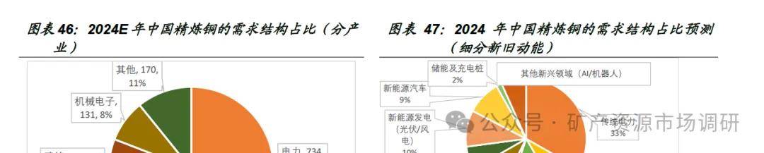 2024 E 年中国精炼铜的需求结构占比(根据SMM 数据):电力7 34 万吨,占比4 6%6%;家电2 19 万吨,占比1 4%4%;交运2 02 万吨,占比1 3%3%;建筑1 20 万吨,占比8 %%;机械电子1 31 万吨,占比8 %%;其他1 70 万吨,占比1 1% 。(具体情况下图和表)