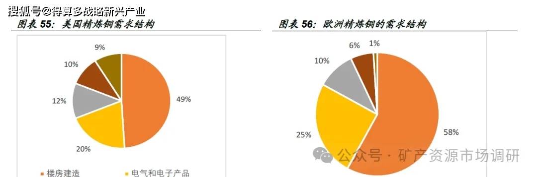 ✓ 美国: 精炼铜需求分布分别为楼房建造(49%), 电气和电子产品