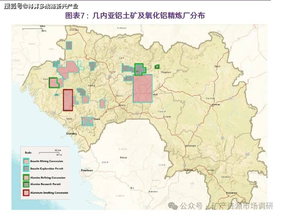 几内亚拥有世界上最多的铝土矿储量,丰富的铝土矿资源是几内亚经济发展的重要龙源。几内亚铝土矿及氧化铝精炼厂主要集中分布于中西部沿海区域,少部分分布于内陆区域。矿产资源开发主要依赖铁路、公路和内河港口运输: