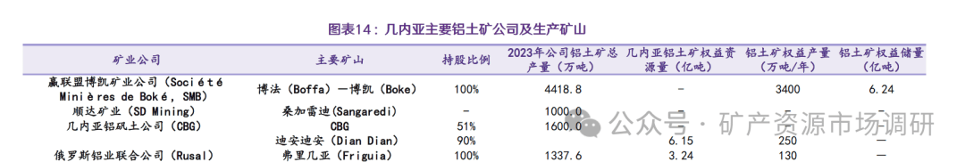 俄罗斯铝业联合公司(俄铝,RUSAL) 拥有铝土矿年产能2200万吨,铝土矿山其中一半左右分布在几内亚。