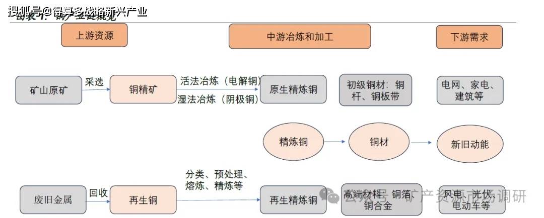 铜产业链:分为上游采选和回收、中游治炼和加工、下游需求三个环节。