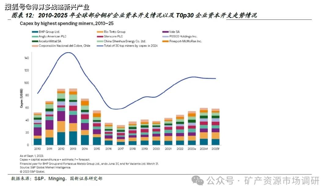 长期指标:矿山资本开支,监测头部企业(如紫金、必和必拓)资本开支及资源并购进度。矿山资本开支决定未来的铜矿供给潜力,反映企业对资源开发的长期预期。根据标普全球数据显示,2020 2022 年全球铜矿资本开支增速仅为5% 10%10%,显著低于2012 年上一轮周期的高峰水平。供给拐点:2023 2024 年为资本开支高峰期,预计2028 2030 年全球铜矿产能达峰(峰值约2741 万吨),随后进入下行周期。