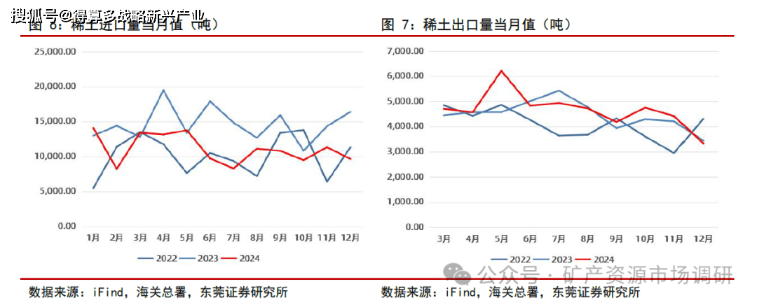 国内方面,2024 年全年开采指标为27 万吨,较2023 年仅增加5.88%,2021 年至2023 年平均增速为22.14%;2024 年冶炼分离指标为25.4 万吨,较2023 年增加4.16%,2021 年至2023 年平均增速为21.80%。近年来,稀土开采及冶炼指标增速逐步放缓,表明国家在稀土行业供需关系变化下及时做出调整,对于优化行业结构、加强资源保护、稳定稀土产品价格等方面具有重要意义。