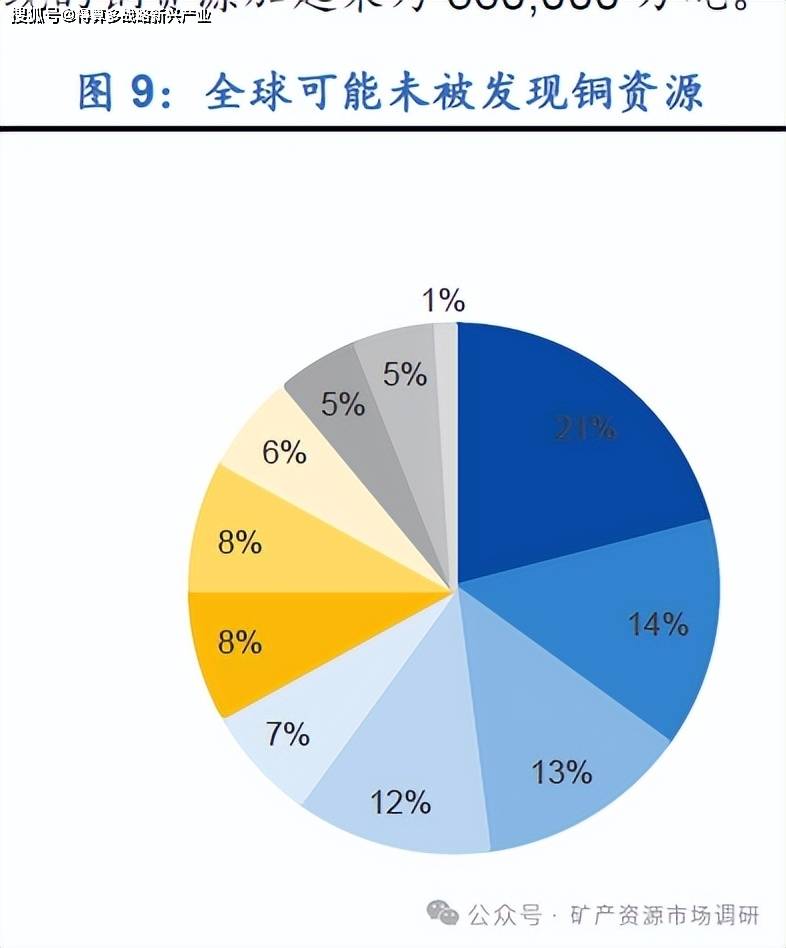 全球铜资源持续勘探评估,目前已确定和可能未发现的铜资源达560,000万吨。2015年,美国地质调查局(USGS)完成了对斑岩型铜矿床和沉积物赋存的层状铜矿床的首次全球未发现铜资源的全球评估。该评估显示,全球未被发现的铜可能存在约350,000万吨,其中 310,000万吨来自斑岩矿床,40,000万吨来自沉积物矿床,最大分布在南美洲。这是对已确定的210,000万吨铜资源的补充,其中74%来自斑岩,10%来自沉积物承载的地层,其余16%来自其他类型的矿床,最大分布在南美洲,占比约为38%。已识别和未发现的铜资源加起来为560,000万吨。