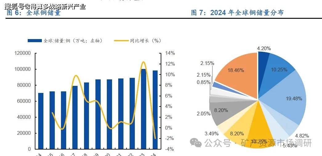 全球储量方面:全球储量增长趋缓,智利铜储量全球第一。2014-2019年,全球铜储量从约70,000万吨增长至87,000万吨,年均复合增长率约4.4%。2020-2024年,全球储量增速明显放缓,且在2024年储量有所下降至98,000万吨,同比下降2%。铜储量主要分布在美洲和大洋洲,地域集中度高,其中,智利铜储量占全球19.48%,稳居第一;澳大利亚和秘鲁并列第二,占比10.25%,前五大资源国控制了全球约57%的铜矿资源量。