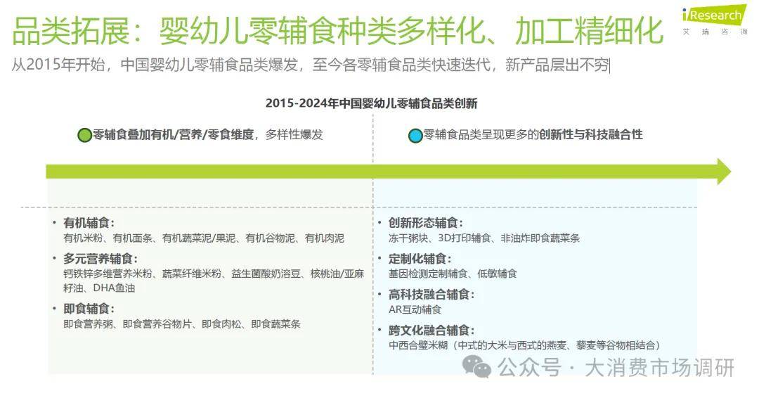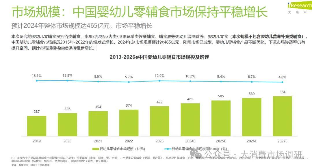 本次研究的婴幼儿零辅食包括谷类辅食、水果/乳制品/肉类/瓜果蔬菜类佐餐辅食、辅食油等婴幼儿调味营养、婴幼儿零食(本次规模不包含婴幼儿营养补充类辅食)。中国婴幼儿零辅食市场经历2015年-2022年的爆发式增长,2024年总市场规模预计达465亿元,刚需市场已成型。婴幼儿零辅食产品不断优化,下沉市场渗透率仍有提升空间,预计市场规模将继续保持稳步增长。