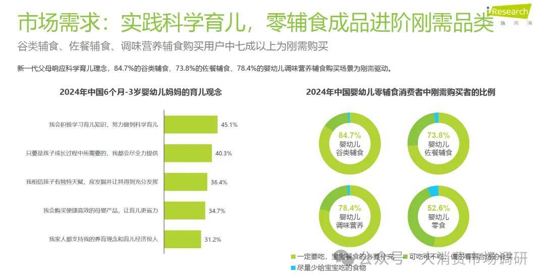 谷类辅食、佐餐辅食、调味营养辅食购买用户中七成以上为刚需购买新一代父母响应科学育儿理念,84.7%的谷类辅食、73.8%的佐餐辅食、78.4%的婴幼儿调味营养辅食购买场景为刚需驱动。