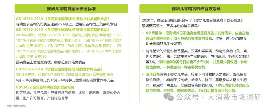 为6个月-36个月婴幼儿提供的食品类应符合最新国家标准,目前国家标准涵盖婴幼儿谷类辅助食品标准、婴幼儿罐装辅助食品标准和辅食营养补充品标准。