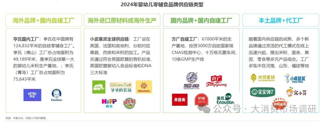 目前已形成国内自建工厂、海外进口原材料或海外工厂、代工厂三种模式,供应链模式成熟亨氏等早期进入国内市场的海外品牌已经在国内建立完整的生产基地,具有全球原料集采及国内生产快速响应的能力。方广、英氏等国内传统品牌已建设稳定的自有供应链。小皮为国外原产地及国外生产的典型代表,以更品质的形象获得国内市场关注。宝宝馋了、窝小芽等淘系新品牌基于成熟的代工产业链,在新品推出速度和品类组合方面获得更大优势