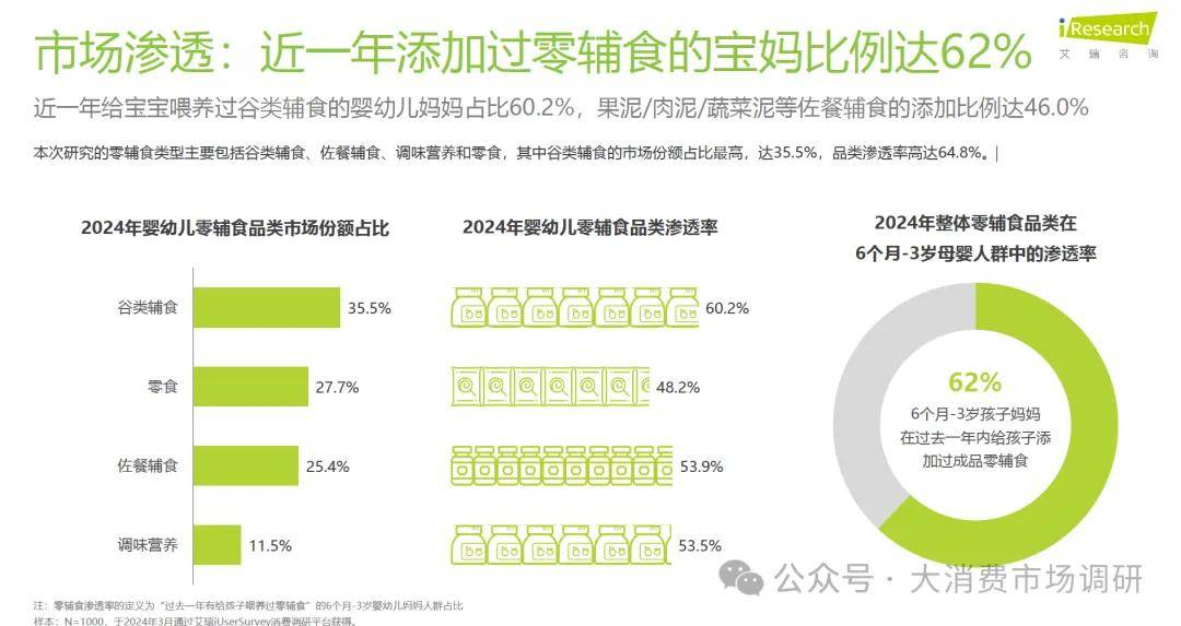 近一年给宝宝喂养过谷类辅食的婴幼儿妈妈占比60.2%,果泥/肉泥/蔬菜泥等佐餐辅食的添加比例达46.0%本次研究的零辅食类型主要包括谷类辅食、佐餐辅食、调味营养和零食,其中谷类辅食的市场份额占比最高,达35.5%,品类渗透率高达64.8%。
