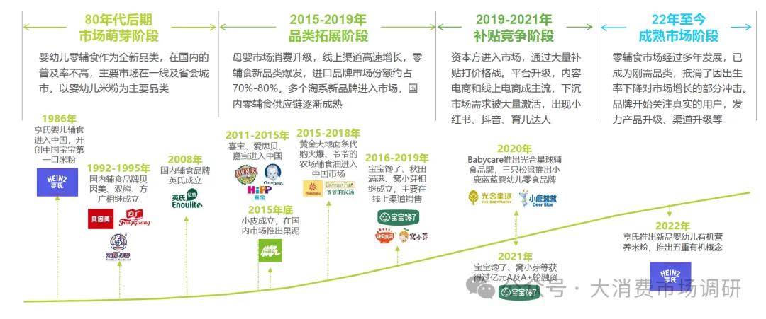 婴幼儿辅食于80年代后期进入中国,经历品类拓展、线上渠道爆发和补贴竞争,进入成熟发展阶段