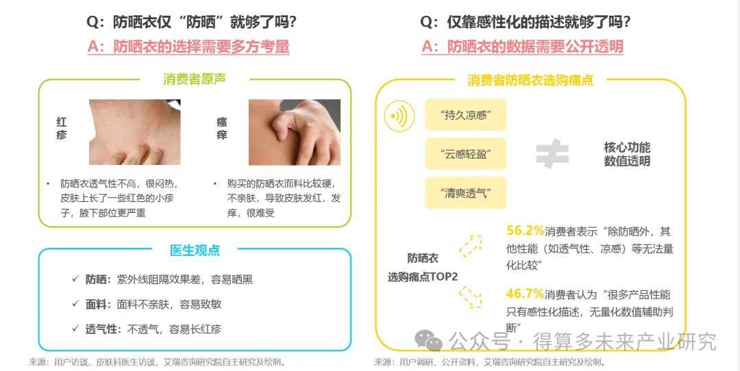 对比市面上的防晒衣,我们观察到部分品牌过于追求单一功能的极致化,这可能导致消费者的穿着体验不佳,甚至对身体健康造成潜在风险。而且,过度强调单一功能也与当今消费者对产品多元化的需求不匹配。除此之外,很多品牌的产品功能数据未公开,这给消费者选择造成了困扰,同时也减弱了品牌的透明度和用户信任感。