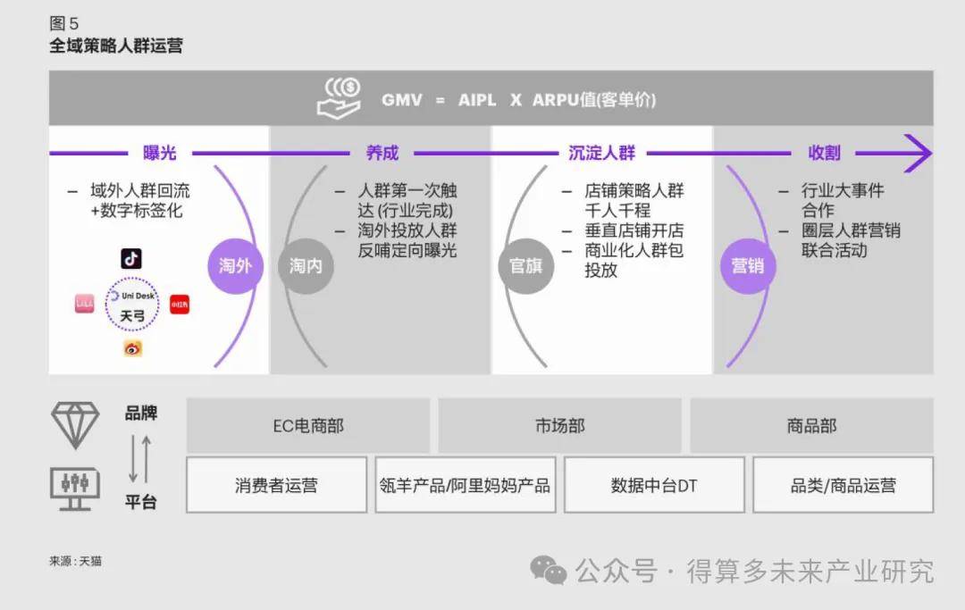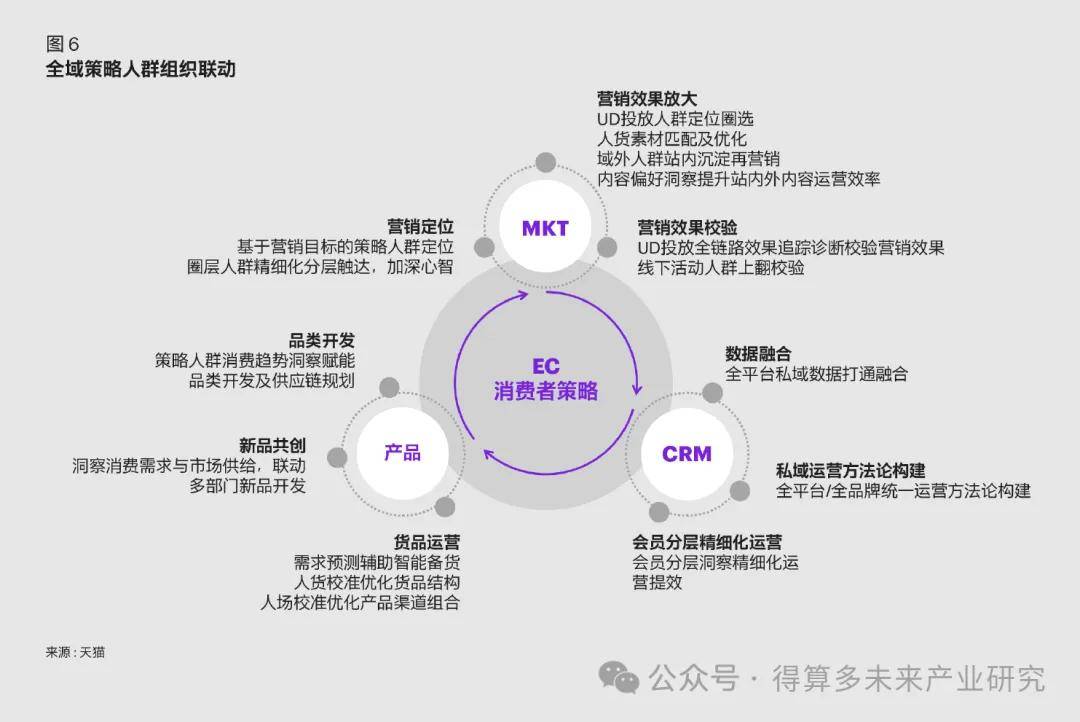 在货品端,从货品生命周期出发,联动阿里平台各产品、企业内部产品以及电商、营销等部门,打通从商品企划、新品上市到新品成长和最终销售爆发的完整闭环;在营销端,以电商部门生意目标为导向,借助消费者策略数据支持,帮助营销部门建立营销目标制定、营销效果校验、营销效果放大等数字化营销全链路,实现全域营销提效;在私域端,结合消费者生命周期阶段特征,以全域视角探索私域消费者精细化运营方法和路径,从人群、货品、权益、场域、营销、内容六大方向制定私域运营策略并在落地过程中不断优化,实现私域资产全面提效(如图6)。以全域策略人群运营为例,通过有效切入MKT价值链,从