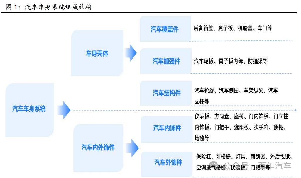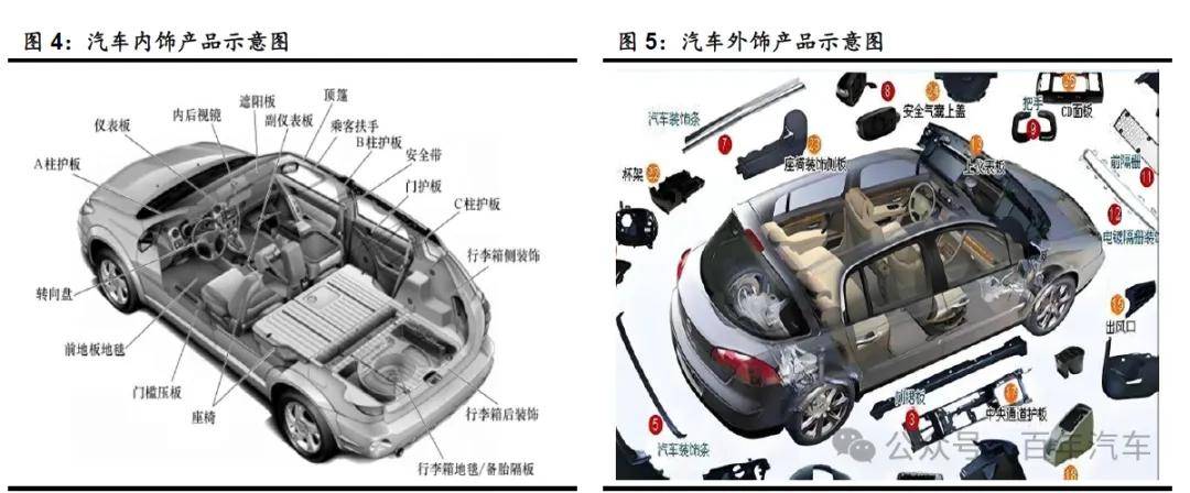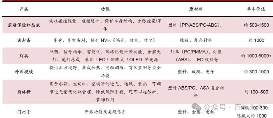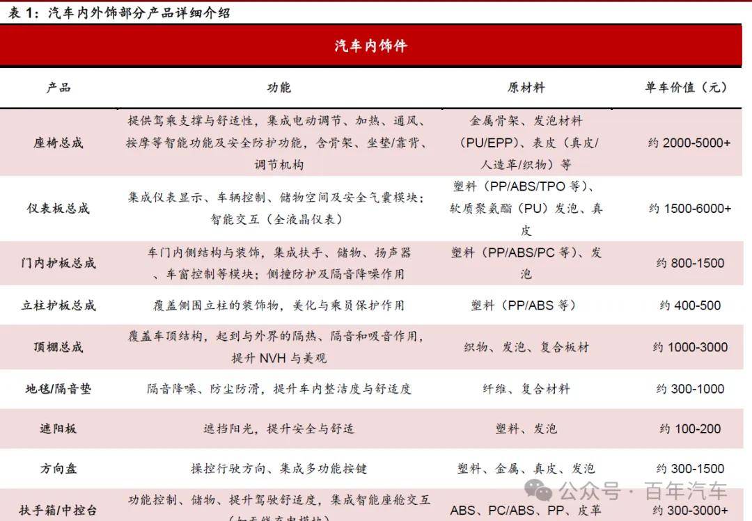 汽车内外饰是集安全性、舒适性、功能性与美学属性于一体的复杂系统,由种类丰富的内外饰件共同构成。内饰件由座椅、仪表板、门护板、顶棚、立柱护板、地毯、方向盘等多样化的内饰模块组成,外饰件由保险杠、前格栅、车灯、门把手、外后视镜、扰流板等丰富的产品共同组成。内饰件聚焦营造舒适智能的驾乘空间,兼具安全防护、人机交互、声学隔绝与储物便利等功能,随着真皮包覆、智能座舱等高端配置升级,单车价值从千元级延伸至数万元级,极大提升了乘坐体验和内饰质感。外饰件则不仅承担碰撞缓冲、结构防护、空气动力学优化等实用任务,还通过造型设计及智能技术集成强化车辆辨识度和科技感,依托于轻量化材料应用与功能进阶,价值量从数百元覆盖至数万元,助力整车性能与品牌形象的双重提升。伴随智能座舱、舒适配置与科技感的持续升级,内外饰的功能集成度和材料创新不断提升,不仅是整车成本的关键组成部分,更是车企实现产品差异化、拥抱电动化与智能化趋势的核心领域,成为决定汽车整体品质与用户体验的核心竞争力。