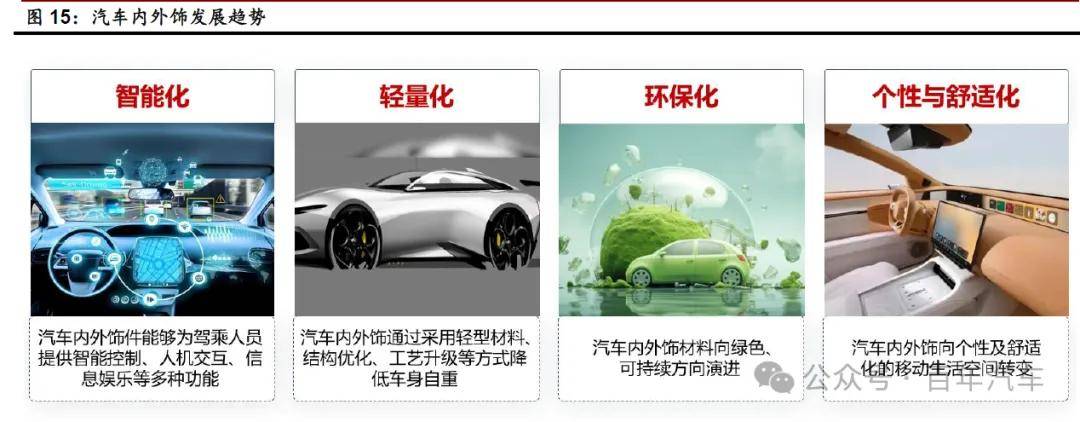 汽车内外饰定位与功能发生根本转变,当前沿着“智能化、轻量化、环保化、个性与舒适化”几大方向协同发展。汽车行业在电动化、智能化、网联化等多重变革的推动下,正经历深度转型期,汽车由传统的“代步工具”向兼具科技感与美学的“移动生活空间”演进。伴随着用户对于智能体验、能效环保与个性定制等多维需求的提升,汽车内外饰的角色定位和设计理念发生了根本性转变,由基础的功能与装饰作用,转变为集智能交互、舒适体验、环保理念与品牌个性于一体的核心价值载体。新一代技术(如大模型、AI 与多模态感知)正在深度融入内外饰全链条,促进硬件集成、智能交互、绿色材料与先进工艺的持续迭代升级,使汽车内外饰成为用户体验与品牌创新的重要驱动力。