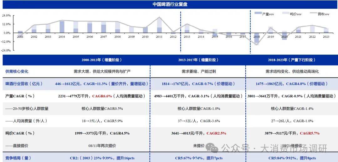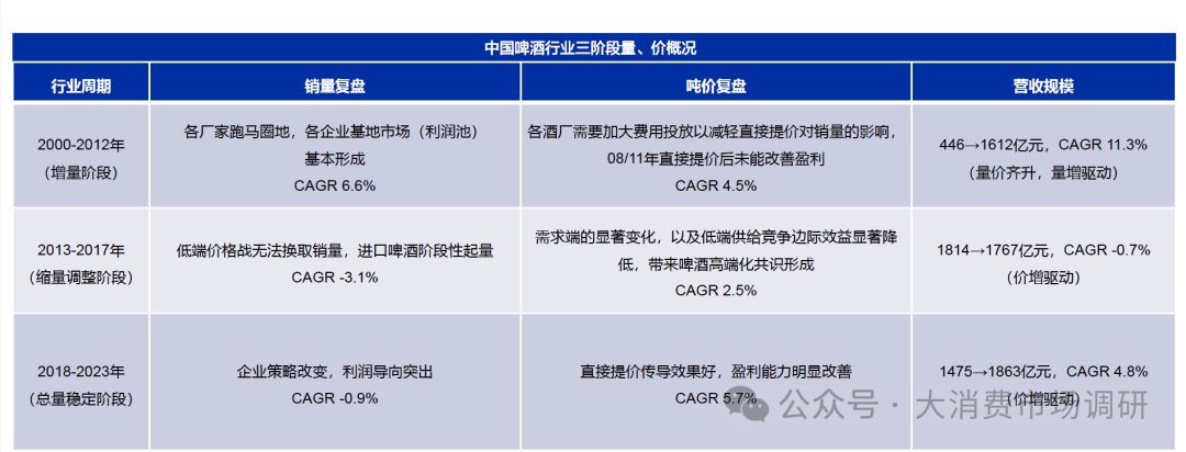 2000-2012年为增量阶段(我国啤酒行业并购整合驱动),2013-2017年为缩量调整阶段(低端价格战竞争加剧),2018年后进入产量下行阶段(高端化结构升级)