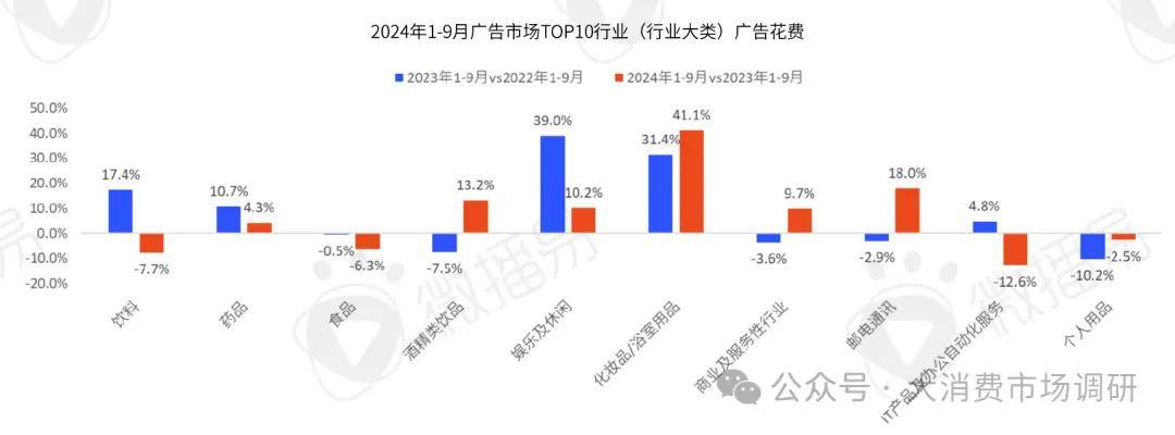 2024年1-9月广告市场Top10行业的广告花费上看,酒精类饮品行业实现超两位数正增长,成为化妆品/浴室用品、邮电通讯类之后增长速度第三的行业。