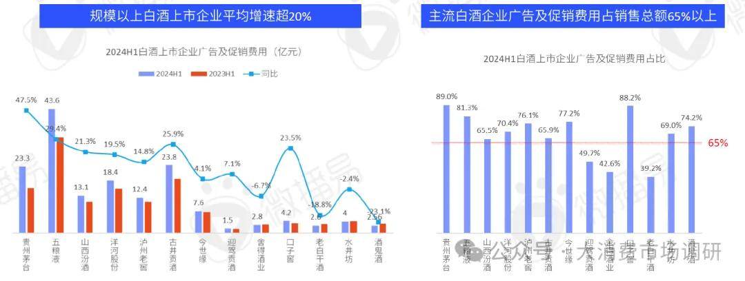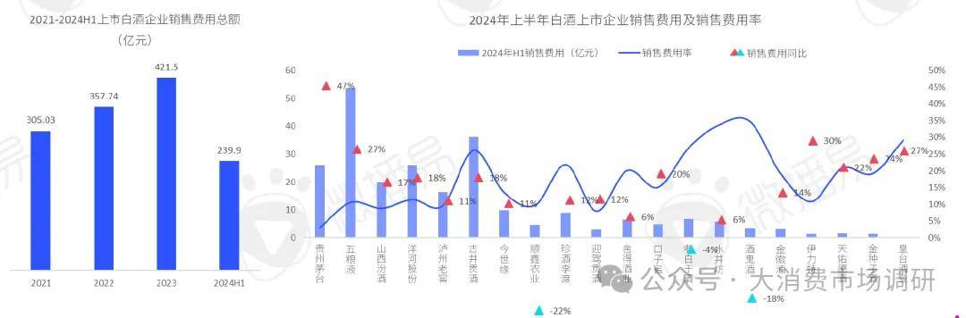 今年上半年,20家上市企业整体销售费用达到239.9亿元,对比去年同期增长18.1%,其中17家销售费用同比增长,反映出绝大多数白酒上市企业加大市场拓展和品牌塑造的投入。销售费用最高的仍然是五粮液达到了53.66亿元,其次是古井贡酒为36.12亿元。销售费用率作为衡量企业销售费用投入效率的关键指标,直接反映了企业在创造相同营收时所花费的费用多少。从数据看,相对高端的酒企销售费用率更低,区域性酒企销售费用率高,贵州茅台实力领先,以3.14%的销售费用率达成了稳定的增长,迎驾贡酒、山西汾酒、泸州老窖、顺鑫农业的销售费用率均低于10%。