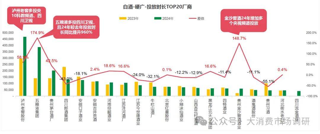 白酒硬广-TOP20厂商:泸州老窖投放时长第一,时长同比提升59%