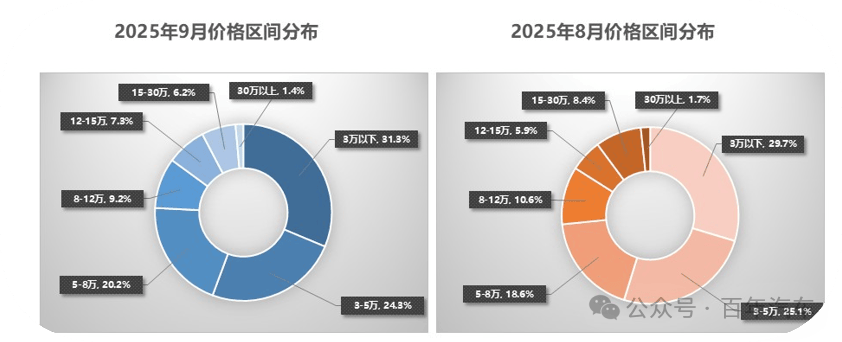 价格分布上看,9月份,15万以上价格较高区间的占比较上月整体有所减少,价格相对较低区间的占比较上月有所增加。