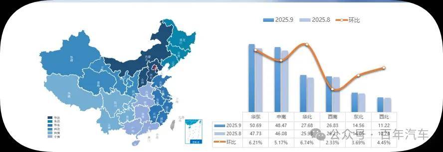 2025年9月,全国二手车市场交易量整体呈现稳健增长态势。从六大区市场表现来看,本月华东、华北及中南地交易量增长尤为突出,其他区域也均实现了不同程度的正增长。
